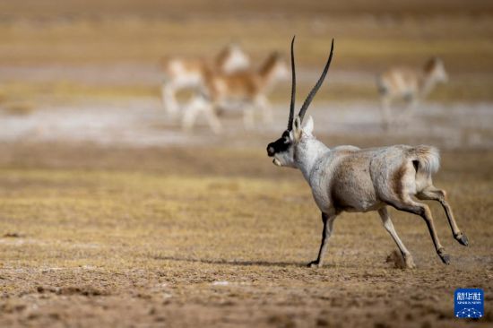 在羌塘国家级自然保护区,一只雄性藏羚羊在奔跑(12月16日摄)。新华社发(旦增努布 摄)